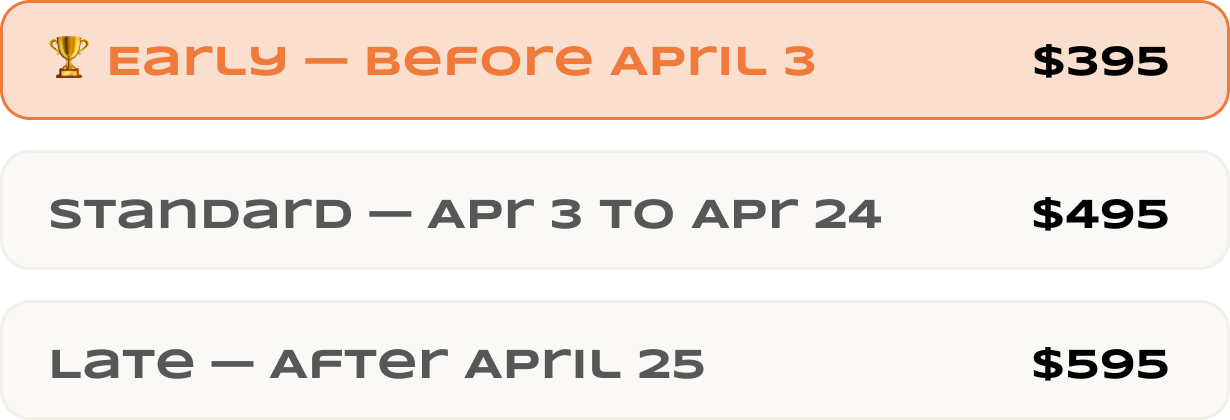 Accepted securely via credit card. Early rate: $395 (before April 3)